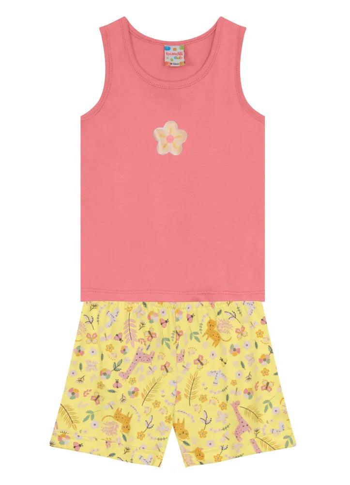 O shorts, também em malha, possui uma estampa rotativa vibrante e um elástico que garante praticidade e liberdade de movimento, perfeito para as pequenas exploradoras.